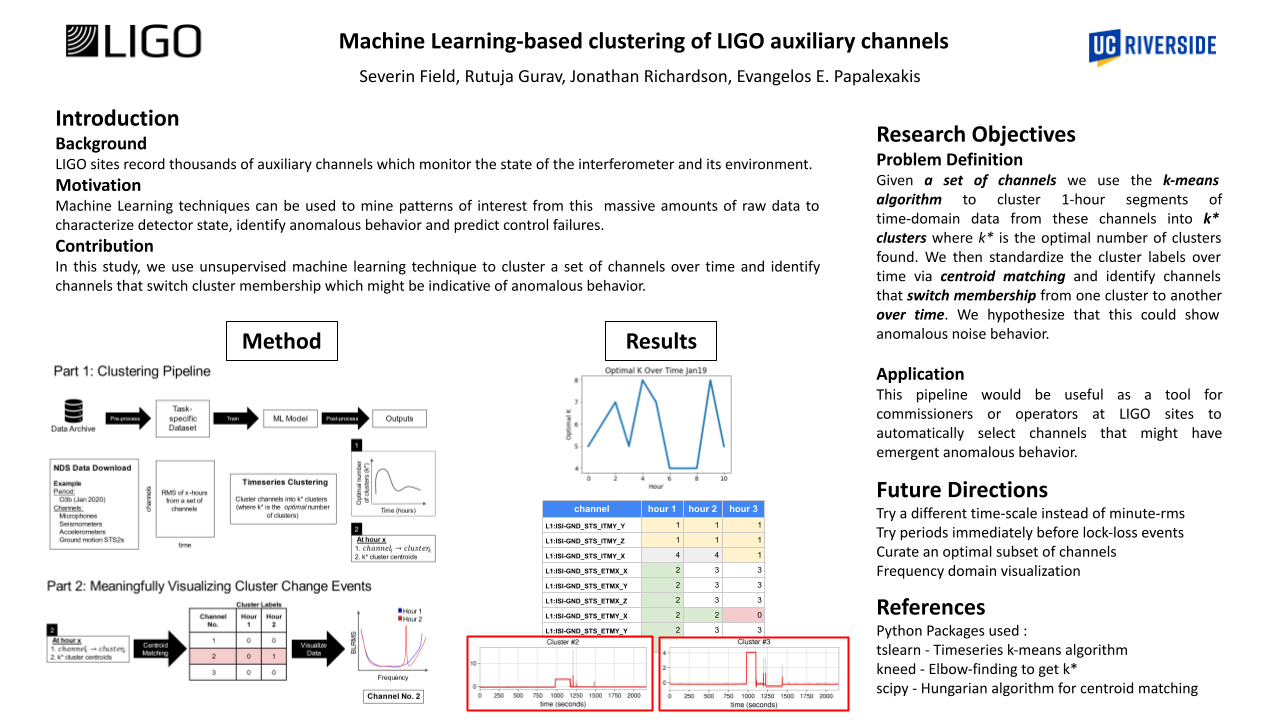 LIGO operates 4km long interferometers to detect gravitational waves. The first GW detection earned a UCR professor, Dr. Barry Barrish, a nobel prize. I collaborated with researchers to develop an anomaly detection algorithm that clusters time-series data from LIGO auxilary channels. Our method involved generating segmented data from hundreds of physical sensors, run dynamic time warping on the data, employ k-means on time-warped data, and then using cluster matching (hungarian algorithm) to monitor the cluster change events. Cluster change events can be interpreted as spurious behavior.